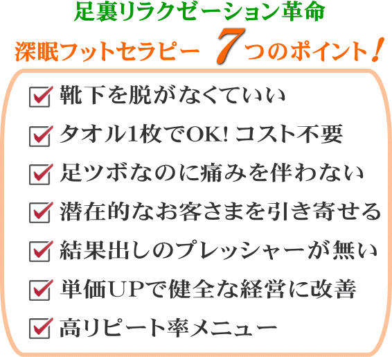 深眠フットセラピーは、そんな経営に苦しんでいるセラピストさまにとって、大きな改善のきっかけとなることでしょう。
