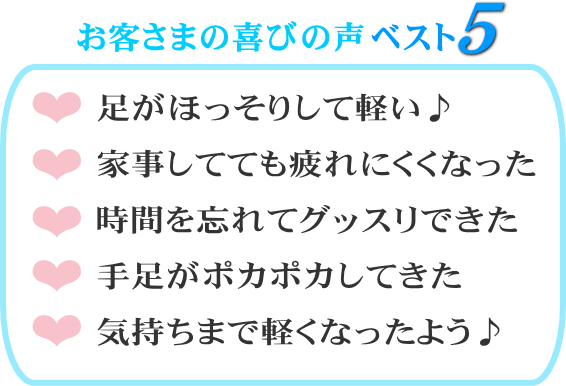 お客様や家族にしましたが、足がポカポカしてくる、気持ち良すぎて途中から記憶がない、足が軽くて楽、と予想以上に喜ばれました。